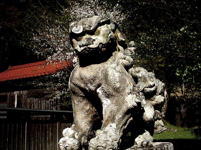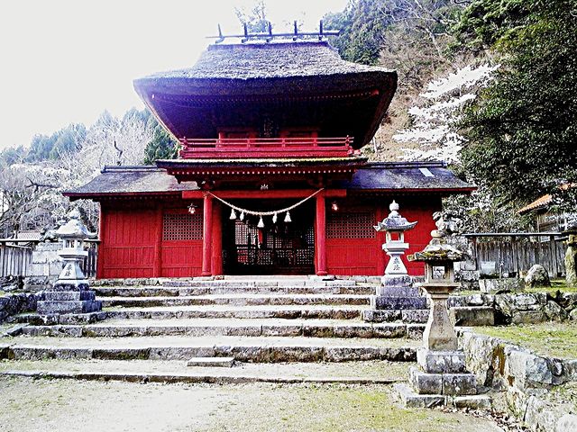 本殿は三間社流造、外周に覆屋(おおいや)を構える。楼門は一間一戸の四脚門で、屋根入母屋造 茅葺、正面に前流れの向拝(こうはい)(屋根檜皮葺)を付ける。楼門の両脇には同じ梁間で桁行2間切妻造の翼廊(屋根杮葺)を延ばす。ともに吉見氏11代 の正頼により永禄11年(1568年)に改築されたもので、正徳元年(1711年)に亀井津和野藩3代藩主の茲親による大修理があるなど、幾度か修築を経 たが、楼門の向拝の冠木(かぶき)中央に配した蟇股(かえるまた)や柱頭の手挟(たばさみ)には室町時代の技法が残されている。昭和47年(1972年) 3月31日に島根県の文化財(建造物)に指定された。